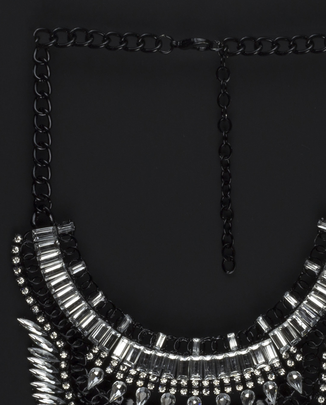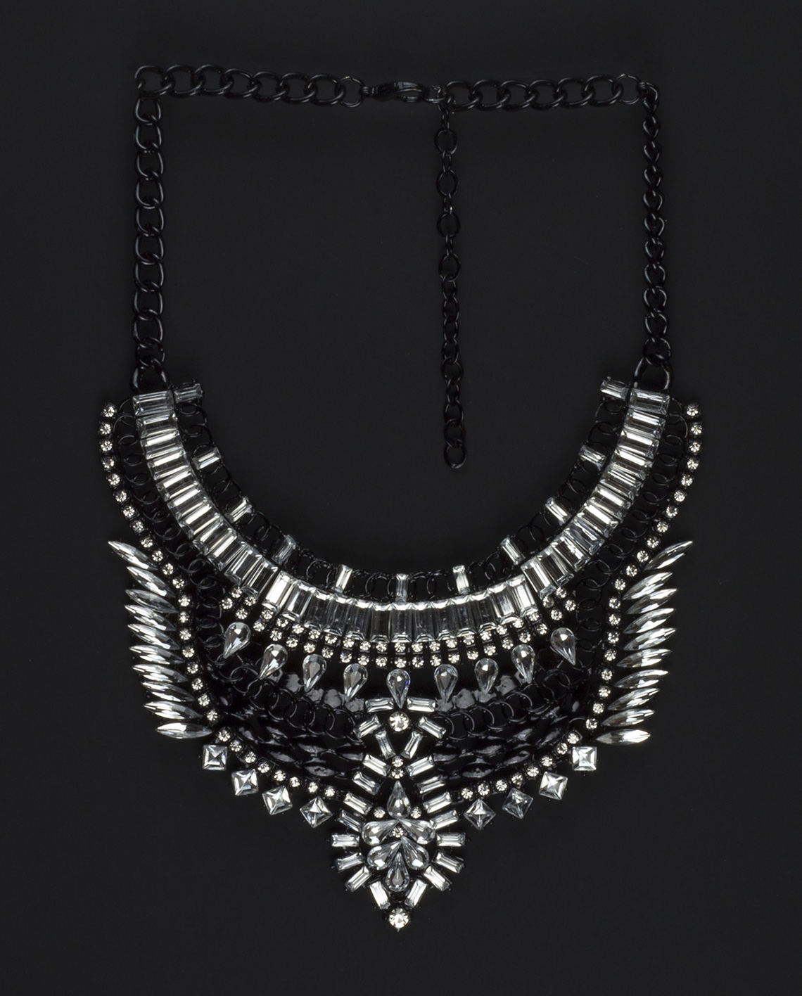 Glamorous yet not over-the-top, this stunning Casablanca Statement Necklace rules the style scene. This statement choker necklace boasts audacious arrays of geometric clusters of clear glass crystals, chunky chains and metal graphics. Perfect to dress with your casual staple pieces, it’ll also complement your favorite black dress.