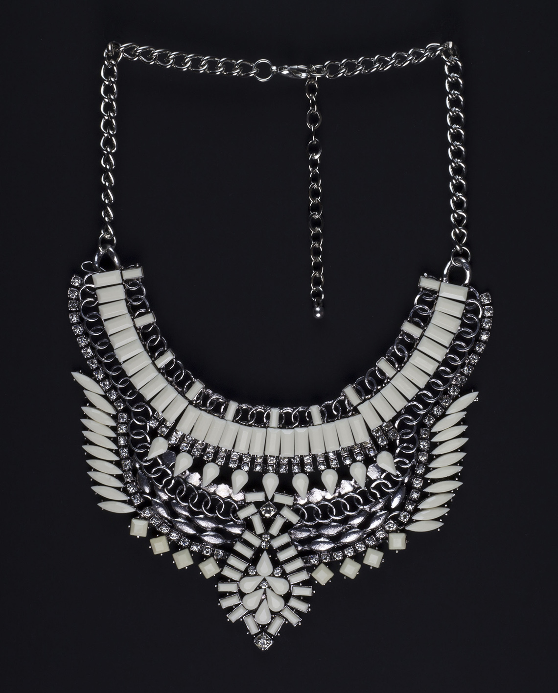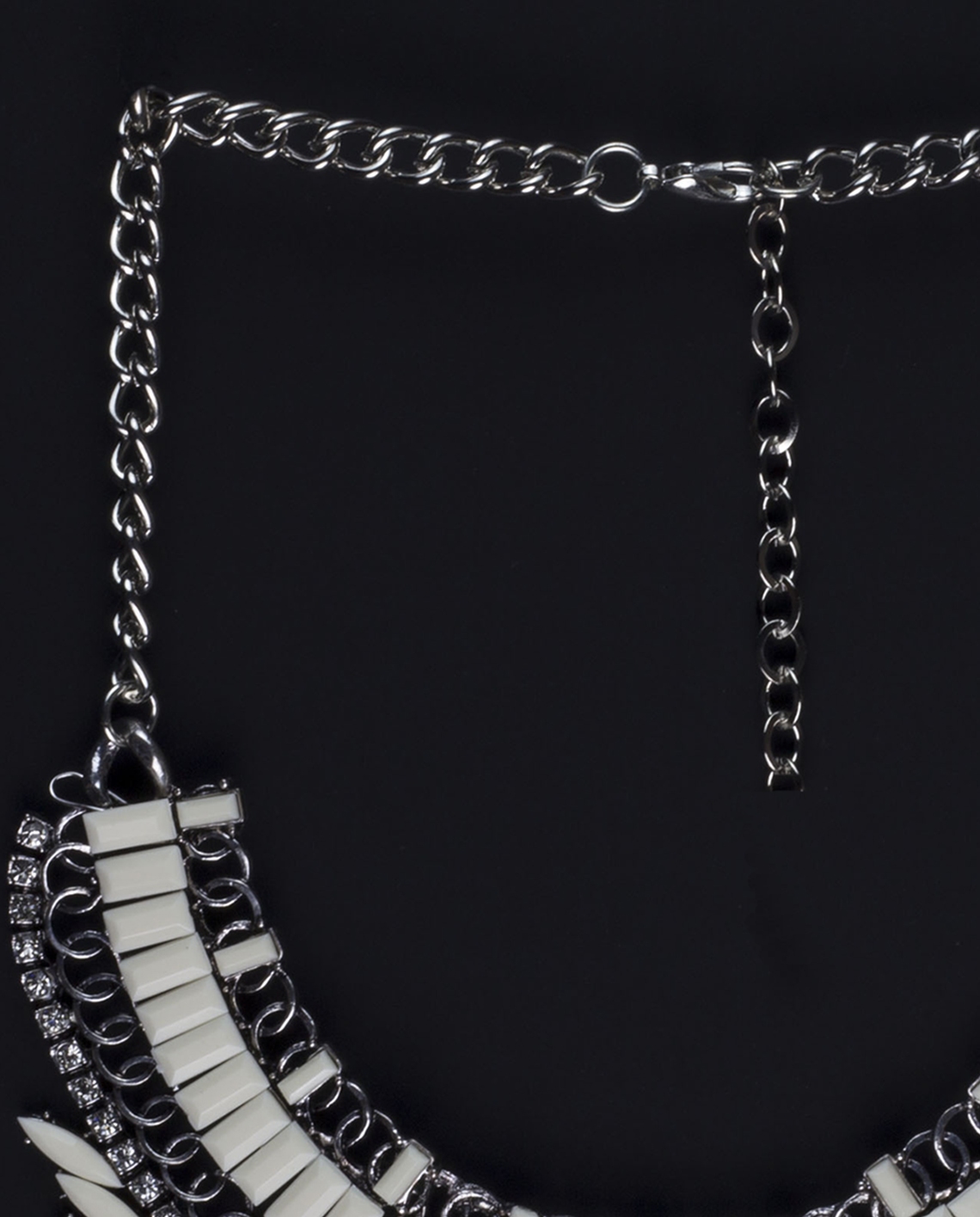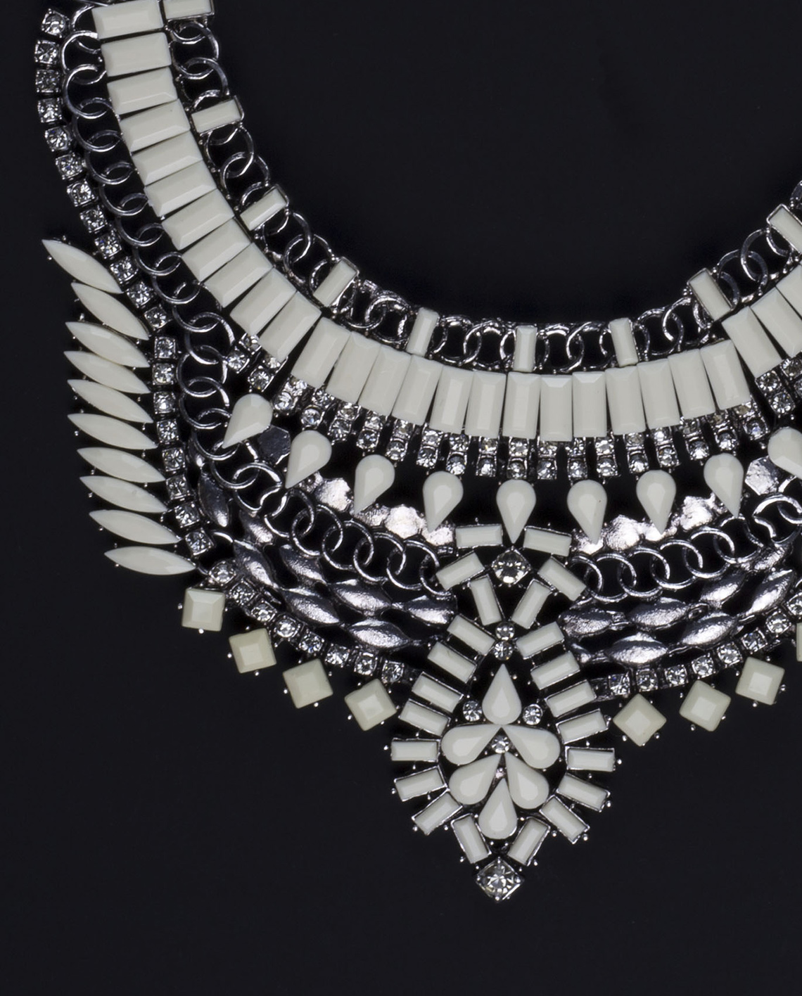 Glamorous yet not over-the-top, this stunning Casablanca Statement Necklace rules the style scene. This statement choker necklace boasts audacious arrays of geometric clusters of clear glass crystals, chunky chains and metal graphics. Perfect to dress with your casual staple pieces, it’ll also complement your favorite black dress.