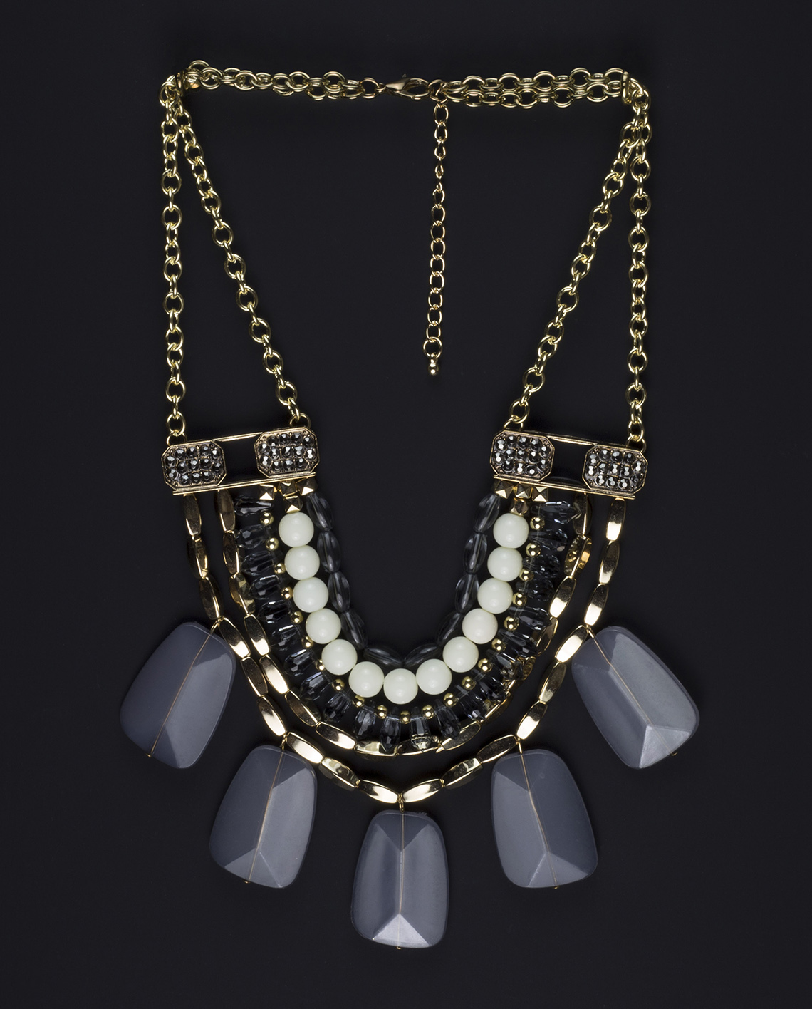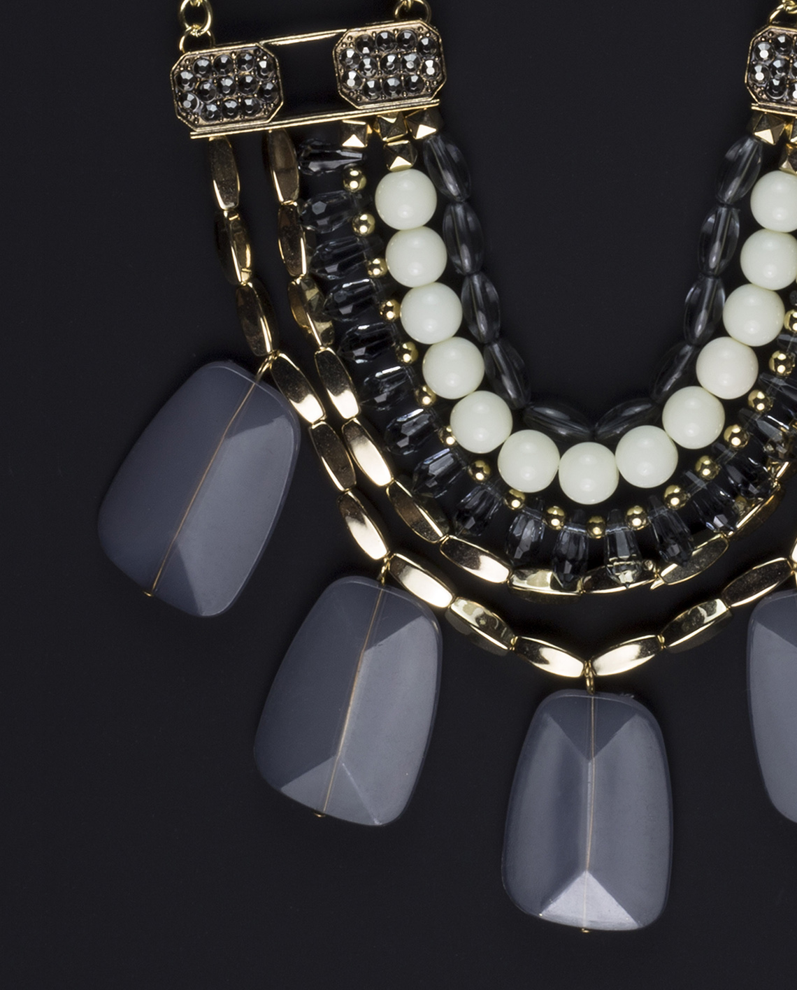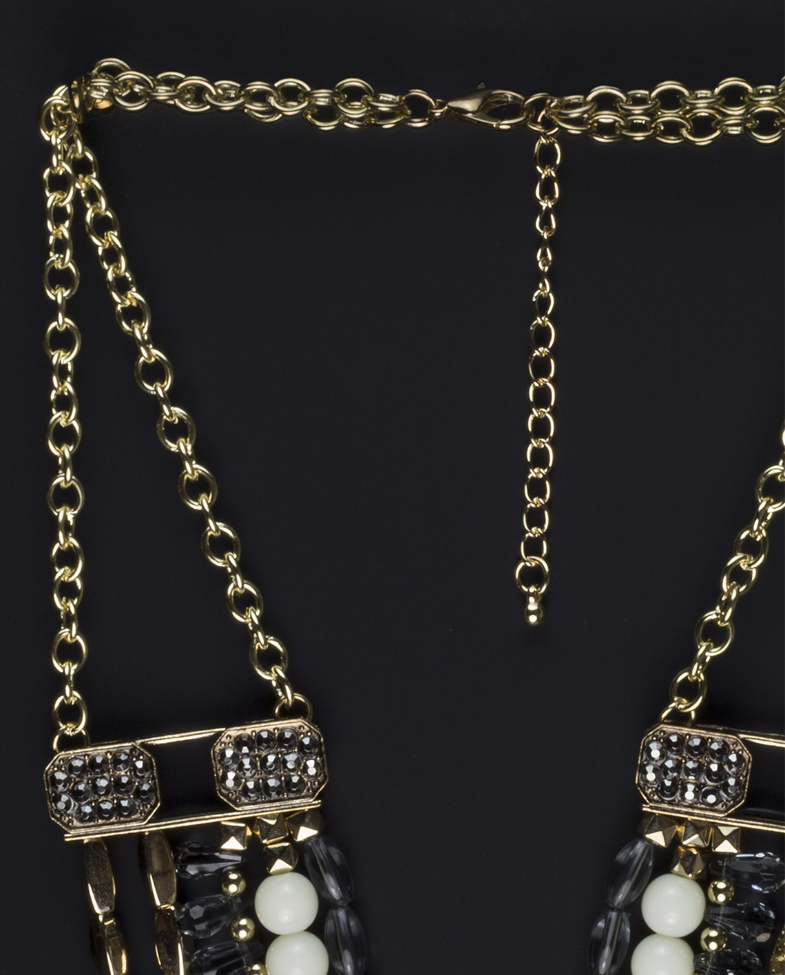 Start a love chain reaction with this covetable piece. Elegant and versatile, featuring clear crystals and beads suspended on a layered gold tone chain, the Take Five Layered Statement Necklace can be dressed up or down