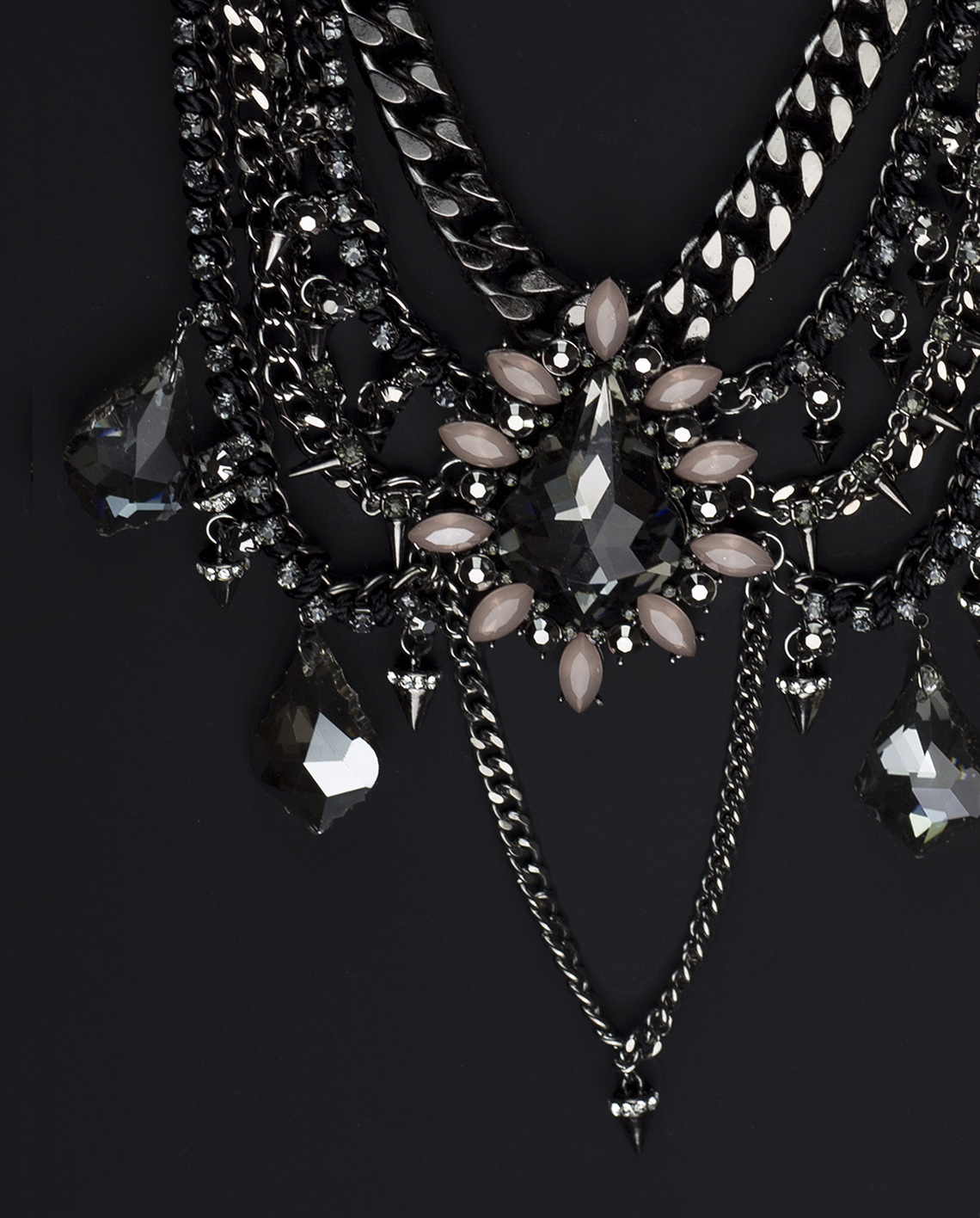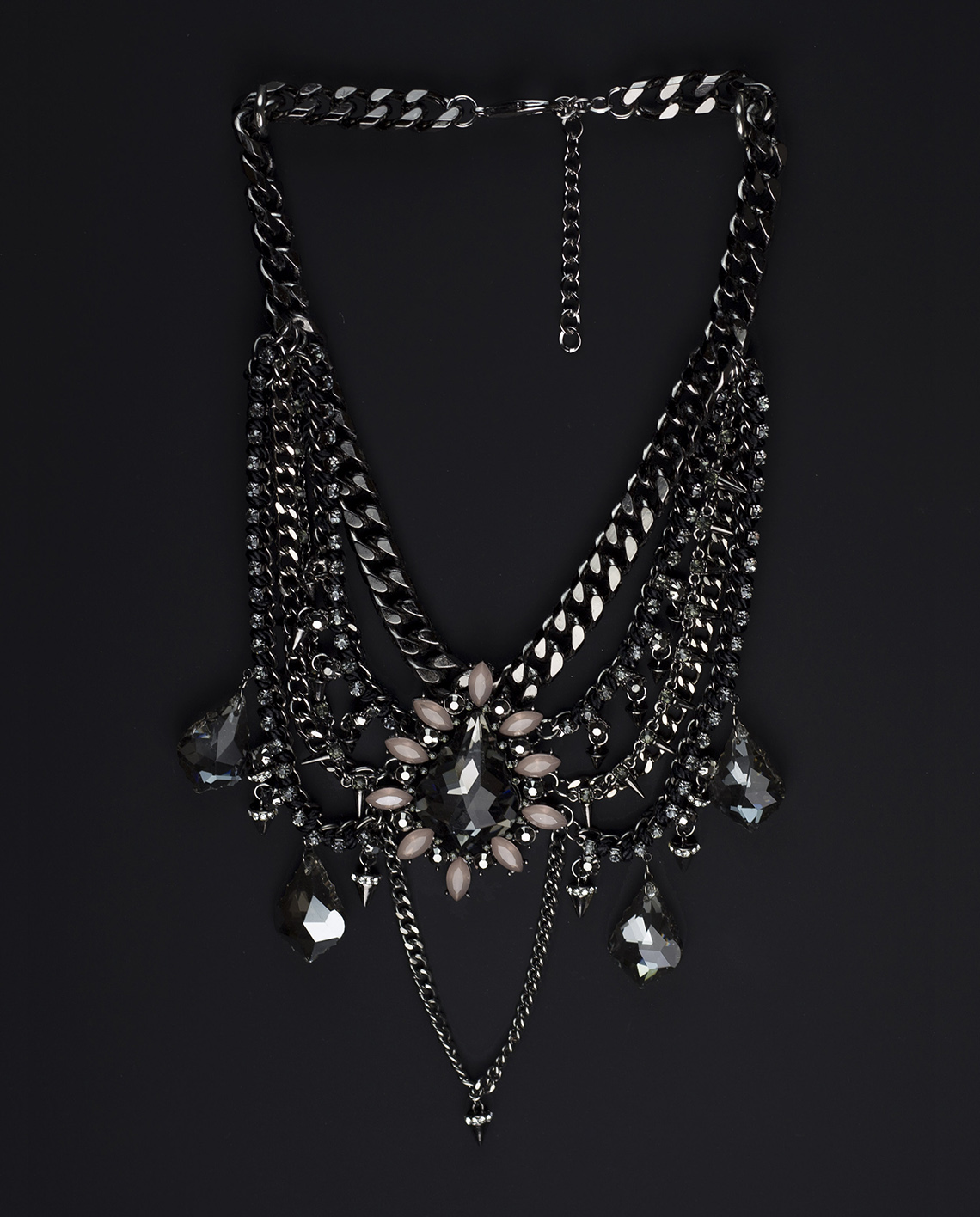 Stand out tall the gorgeous The Tuxedo Layered Statement Necklace. Featuring black painted hematite stone, glass crystal teardrop pieces and layered chain, in a flower motif, suspended on a black chain, the statement necklace exudes elegant romantic vibes.