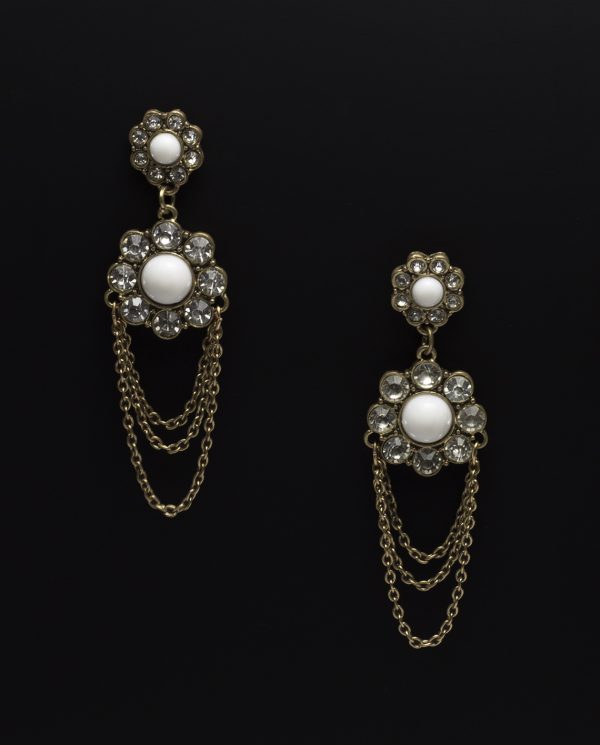 Graceful and lustrous, these dainty ear crawlers are the height of modern style. The earrings are crafted out of goldtone metal and white stone which shines beautifully against the lustrous crystals invoking feelings of romantic Gatsby era.
