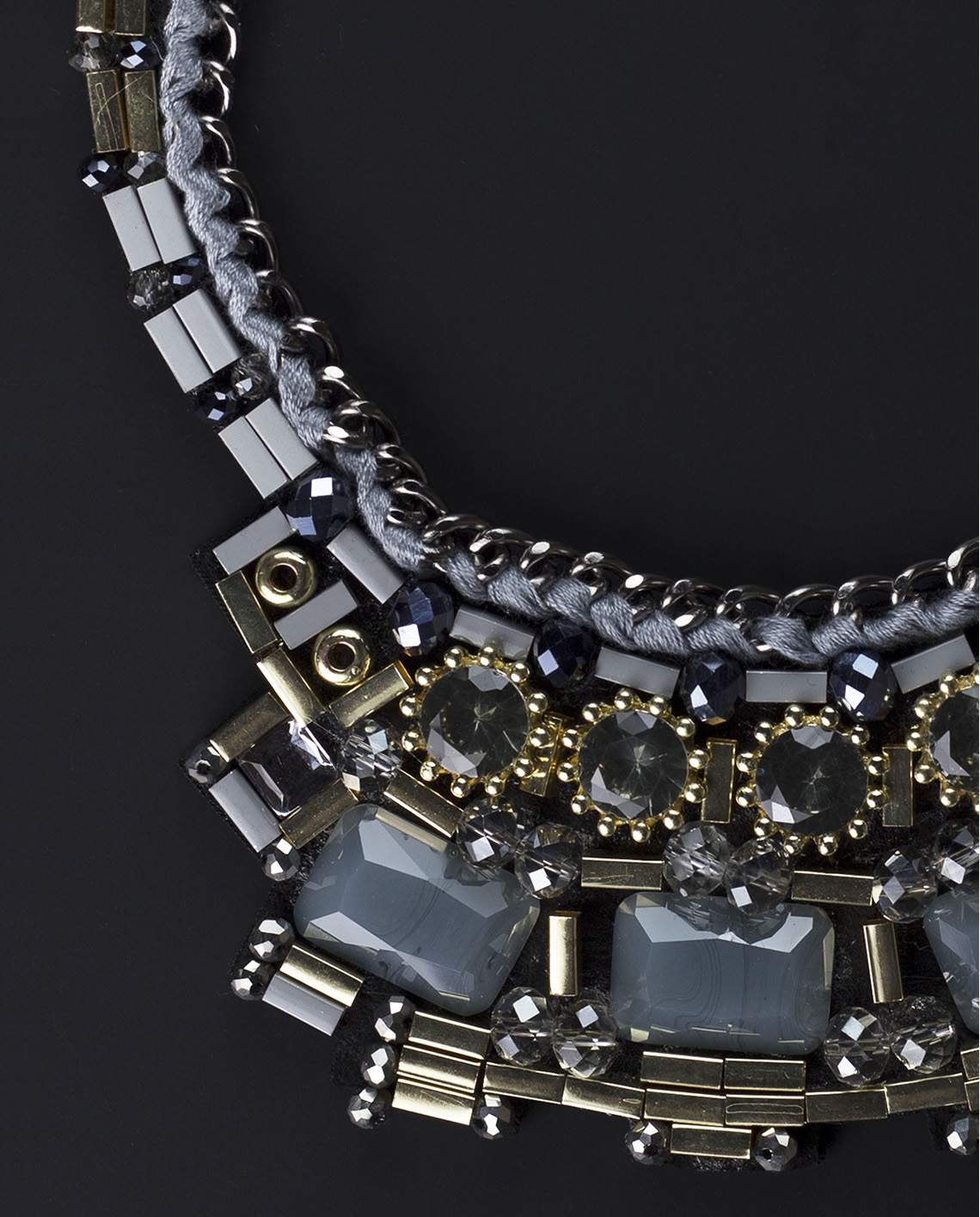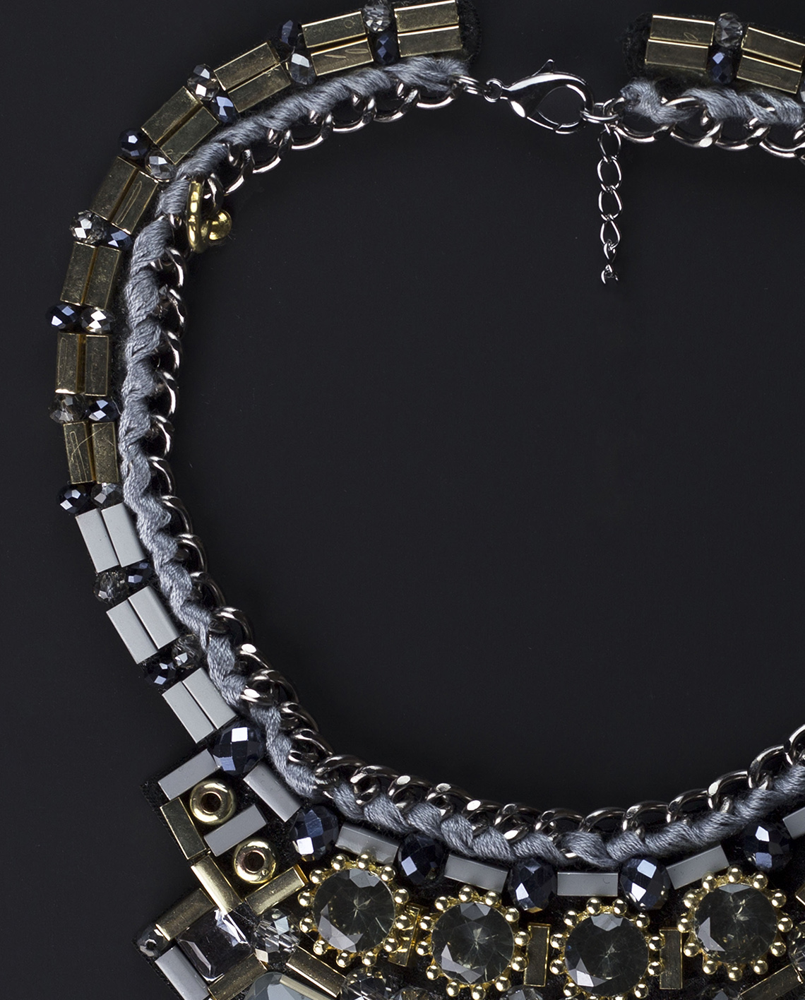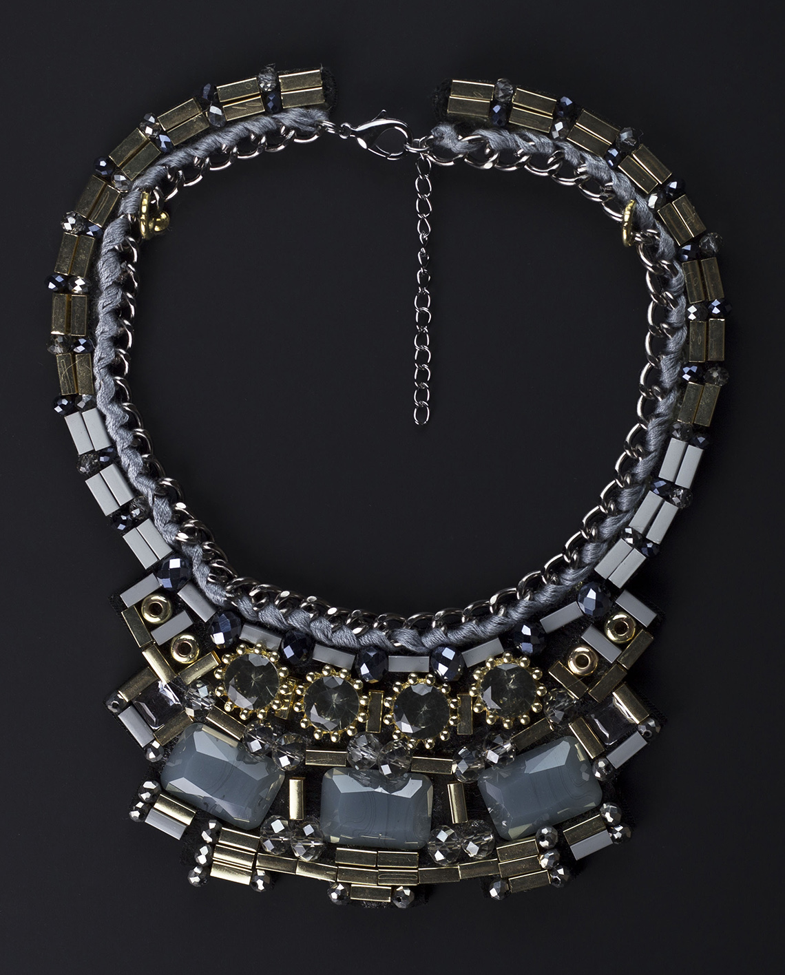 From the curving lines and sharp angles to the timeless luminosity of the crystal stones, this elegant necklace is just the accessory you need. The Light Catcher Crystal Collar Statement Necklace features intricate glass crystals and stone accents suspended on a silver chain with weaved thread.